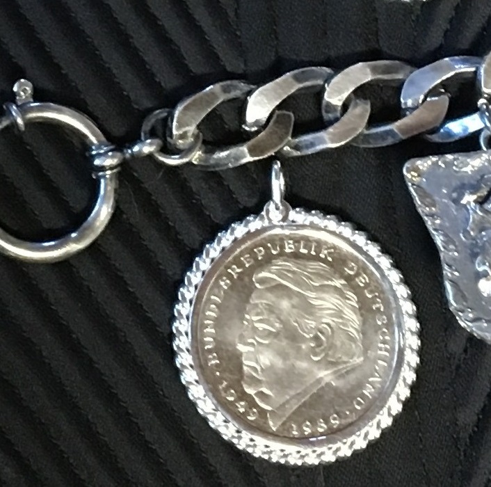 Aus kleinen Restbeständen dieser gebrauchten Umlaufmünzen entwickelte ich die Idee, Schmuckanhänger zu gestalten. Alle Geldstücke sind mit hochwertigem Sterlingsilber 925/1000 eingefasst. Die Münzen sind nicht durchbohrt. Die Kollek-tionsteile werden auf Bestellung gefertigt.